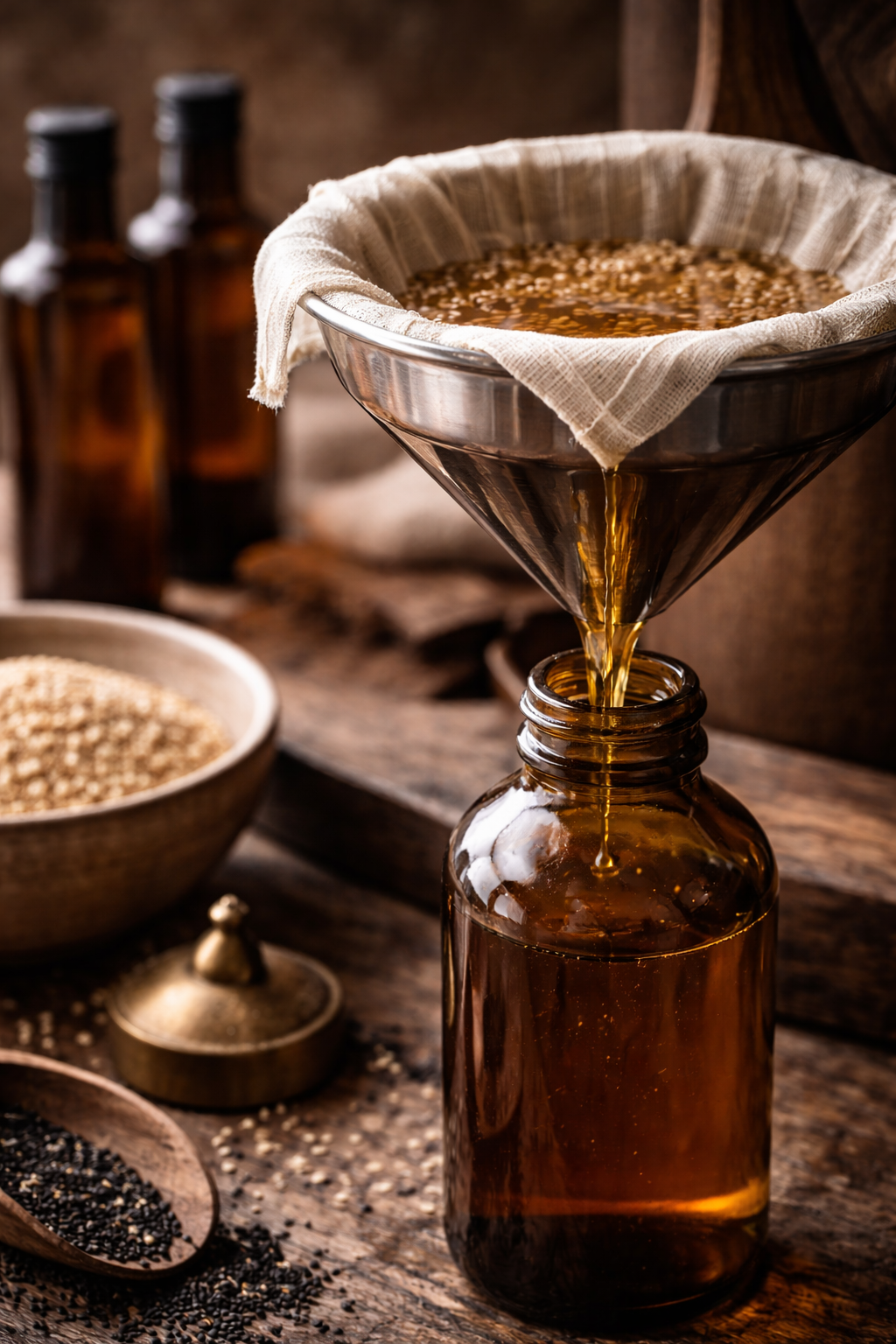 4. The oil is gently filtered and bottled fresh, in small batches.